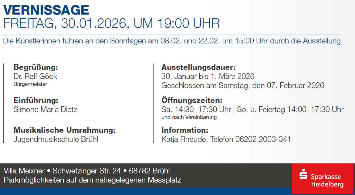 Vernissage am 30.01.2026 um 19:00 Uhr mit einer Begrüßung durch Bürgermeister Dr. Ralf Göck sowie einer Einführung durch Simone Maria Dietz. Für die musikalische Umrahmung sorgt die Jugendmusikschule Brühl.