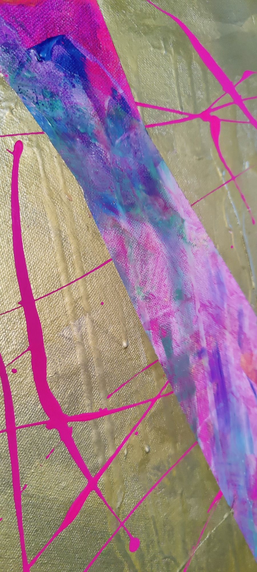 Die neonpinken Spritzer wirken spontan, roh und voller Leben – wie Emotionen, die aus dem Raster der Struktur ausbrechen, ein visuelles Echo von Leidenschaft und Freiheit. Sie durchbrechen die Ordnung, verleihen dem Bild Rhythmus und lassen es fast musikalisch erscheinen.