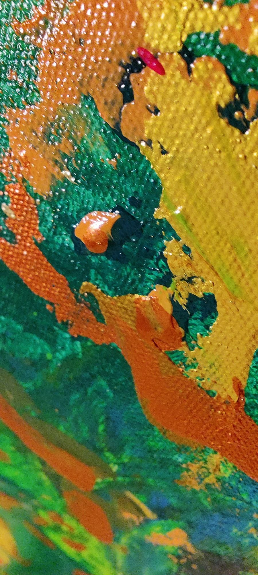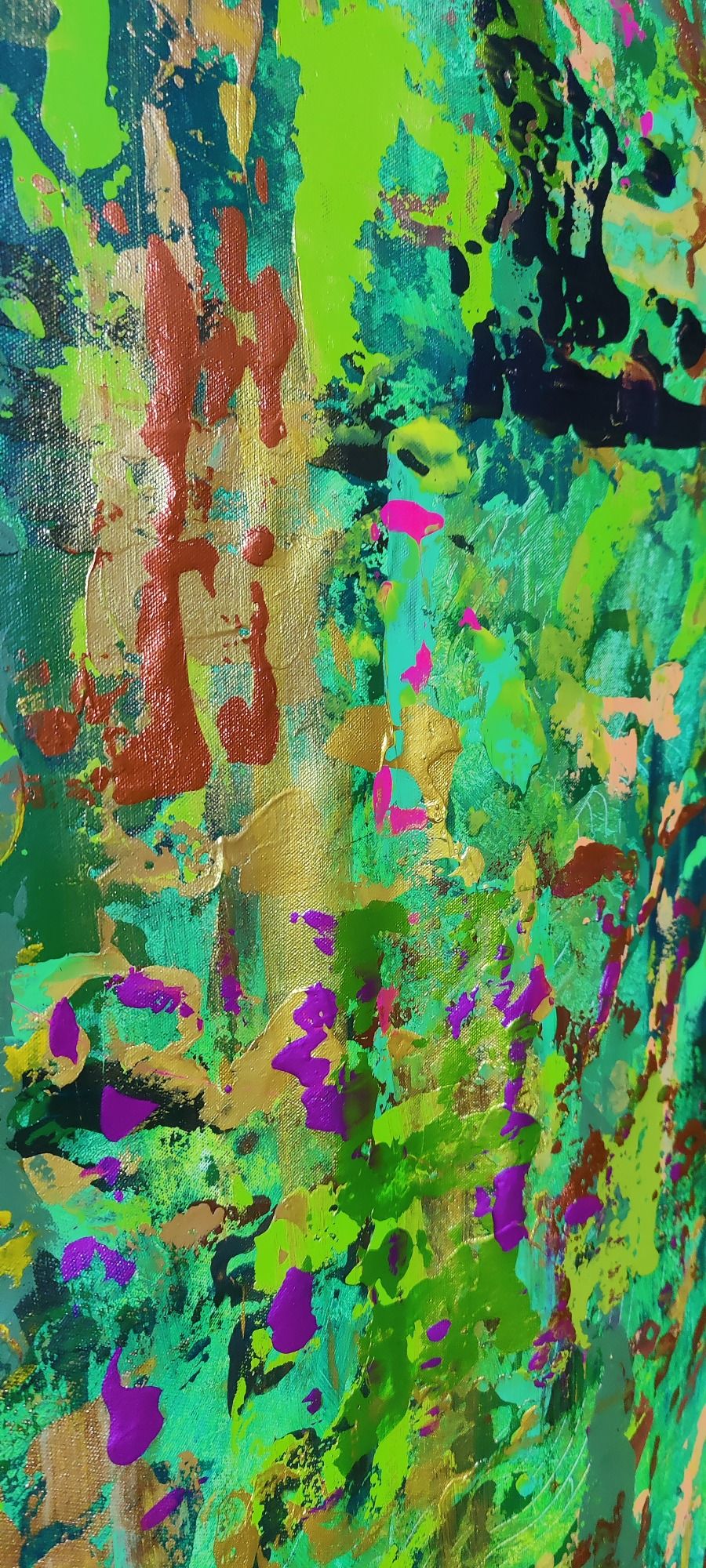 Dieses Kunstwerk strahlt eine lebendige, organische Energie aus – ein dichter, wilder Wald aus Farbe, der in Smaragdgrün, Jade und tiefem Moos leuchtet. Es scheint, als würde man in eine Nahaufnahme der Natur eintauchen, in die feinen Strukturen von Blättern, Nadeln und Baumrinde, verwoben mit Licht und Schatten.