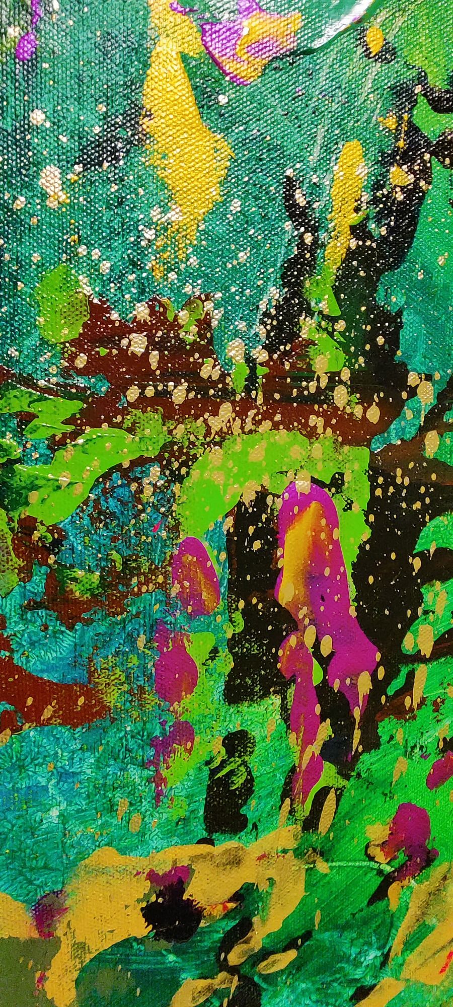 Goldene Spritzer durchziehen die Fläche wie Sonnenstrahlen, die durch das Blätterdach brechen und den Wald in magischem Glanz baden. Dazwischen blitzen Akzente in leuchtendem Pink, warmem Ocker und tiefem Blau auf – wie versteckte Blüten oder Edelsteine, die im Dickicht aufblitzen.