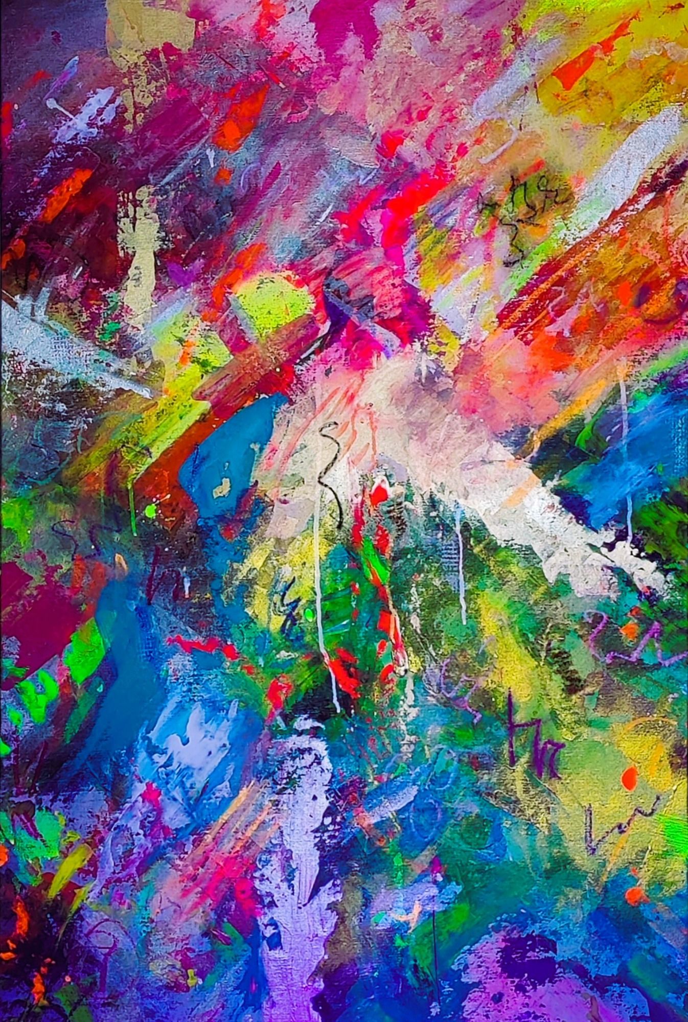 Hochpigmentierte Acrylfarbe, welche in UV Licht leuchtet, nachleuchtende Farben (fluoreszierend) sowie eine große Portion Herzblut stecken in meinen Bildern.