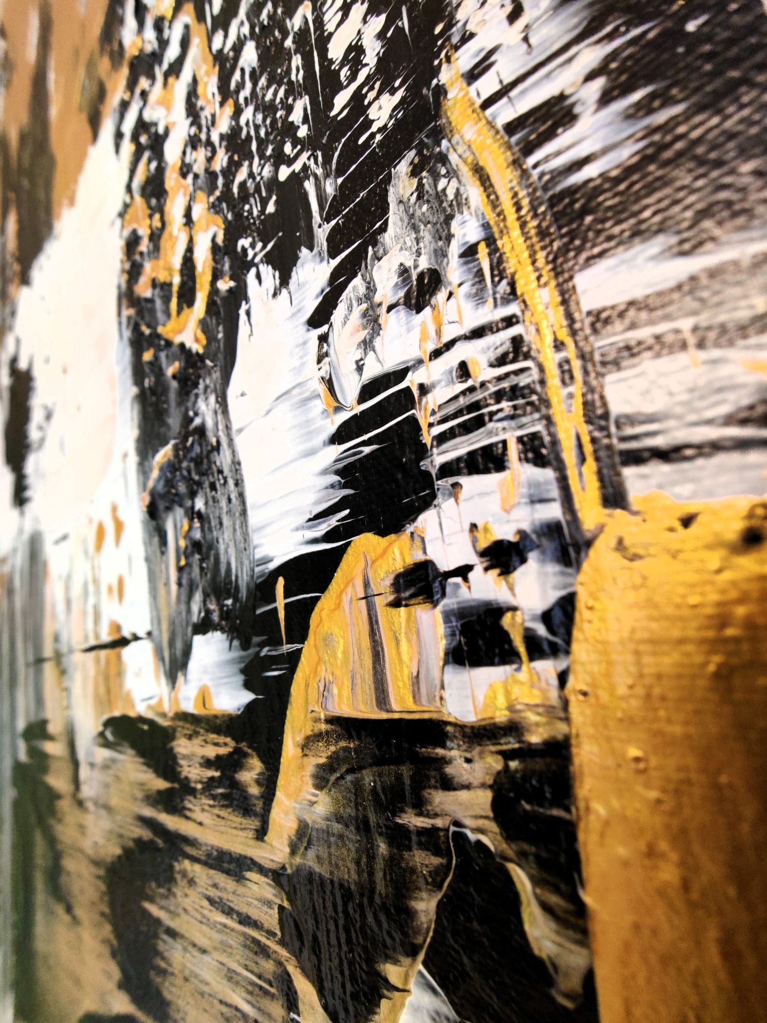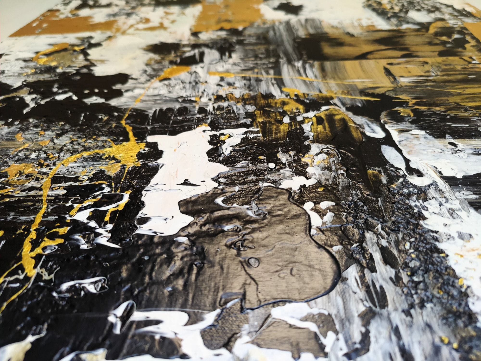 Diese Idee des Endes als notwendige Transformation bildet den emotionalen Kern des Zweiersets. In der Rakeltechnik wird Farbe nicht beherrscht, sondern freigegeben. Schwarz und Weiß prallen aufeinander, verschieben sich, reißen auf – vergleichbar mit Wagners musikalischer Dramaturgie, in der Spannung, Verdichtung und Auflösung untrennbar miteinander verwoben sind. Die Bildflächen wirken wie visuelle Partituren eines inneren Dramas.
