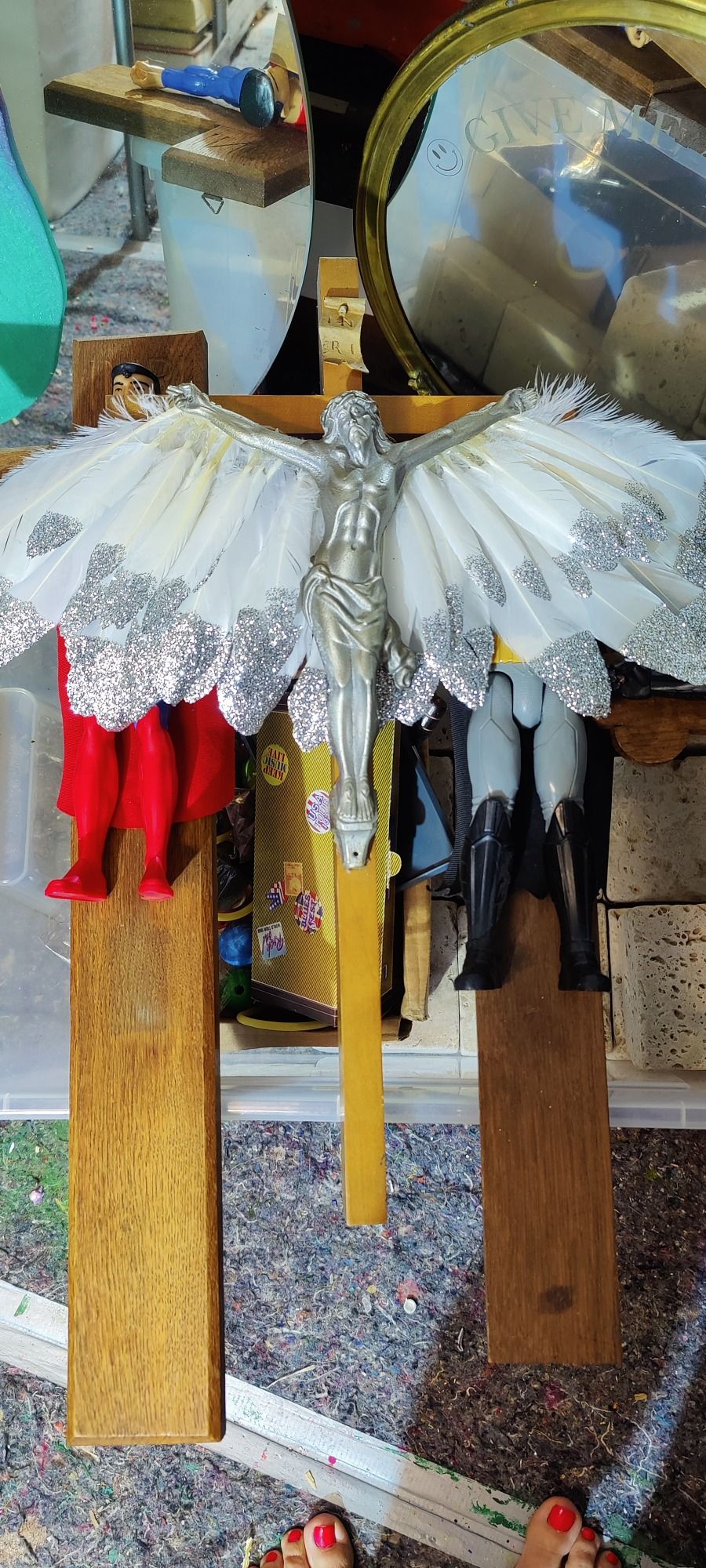 Jesus mit aufgeklebten Federn als Engel