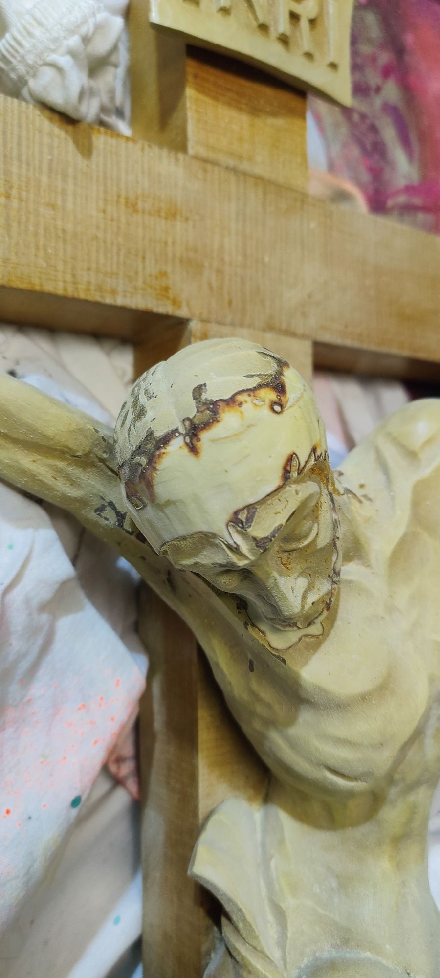 Hier möchte ich nicht den Glauben angreifen, sondern die Instrumentalisierung und Materialisierung, gerade die Figur Jesus scheint für mich eine große Kulisse zu bieten.