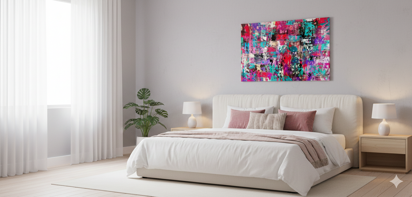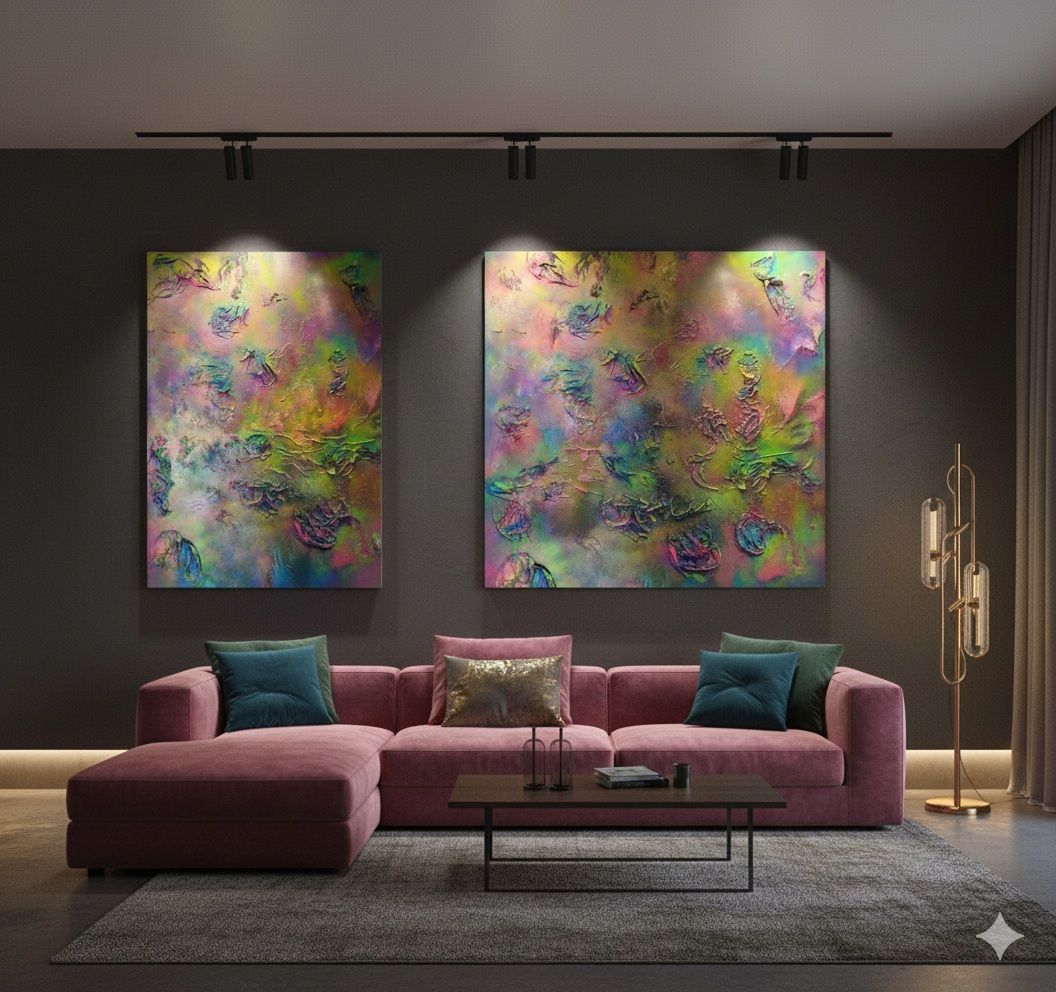 Das Spray legt sich wie ein atmosphärischer Schleier über das Werk. Die Farben Pink, Gelb, Grün, Türkis in irisierenden Übergängen schaffen ein magisches Kunstwerk