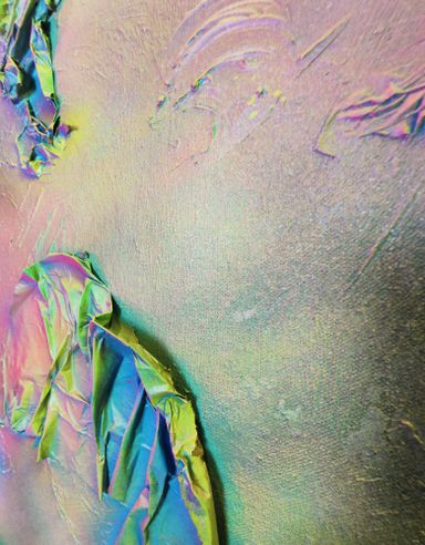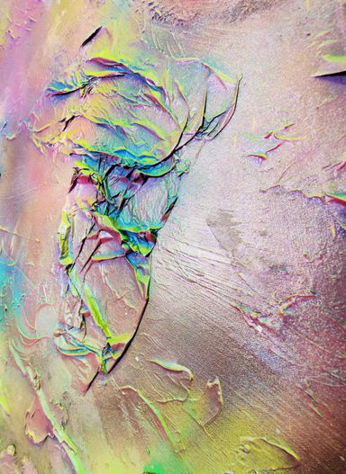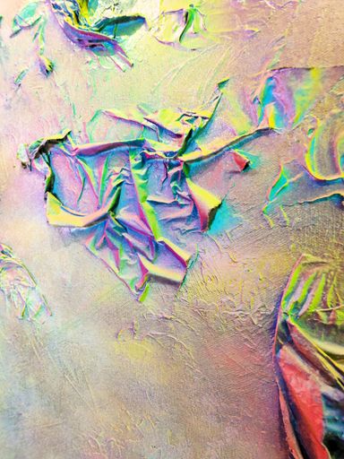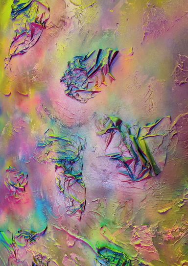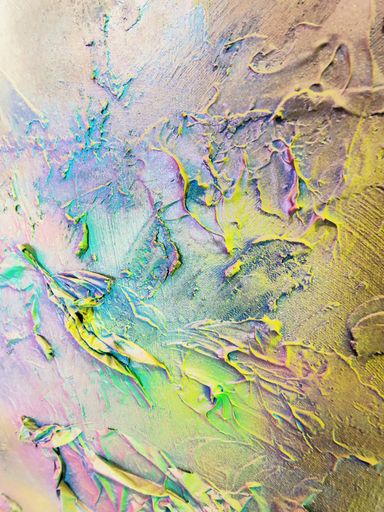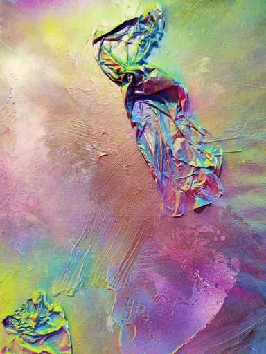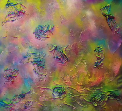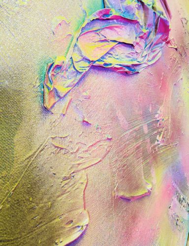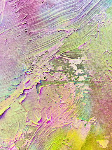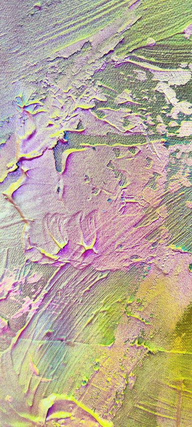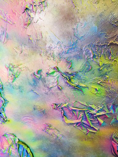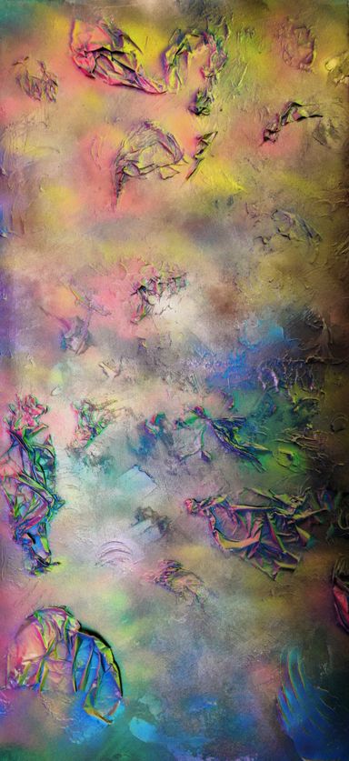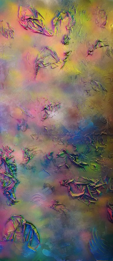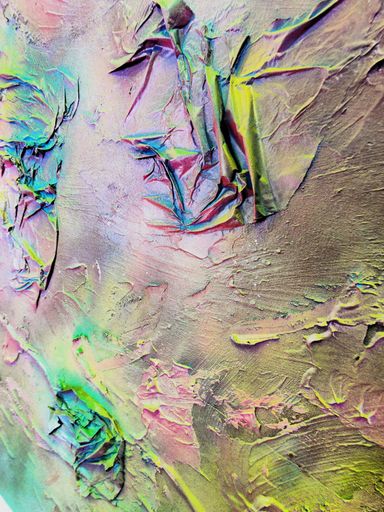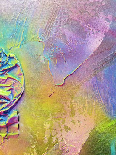 Das Spray legt sich wie ein atmosphärischer Schleier über das Werk. Die Farben – Pink, Gelb, Grün, Türkis, irisierende Übergänge – fließen ineinander, ohne Dominanz. Sie wirken emotional statt narrativ.