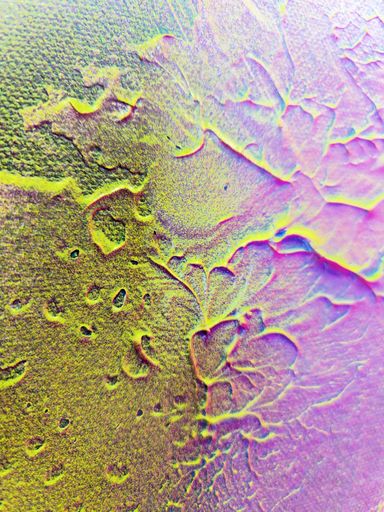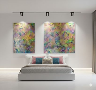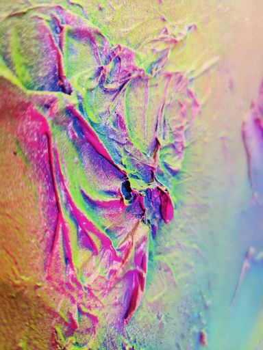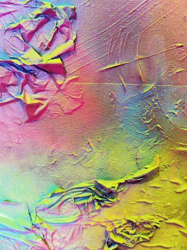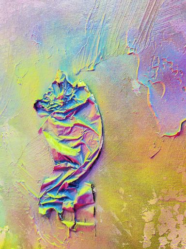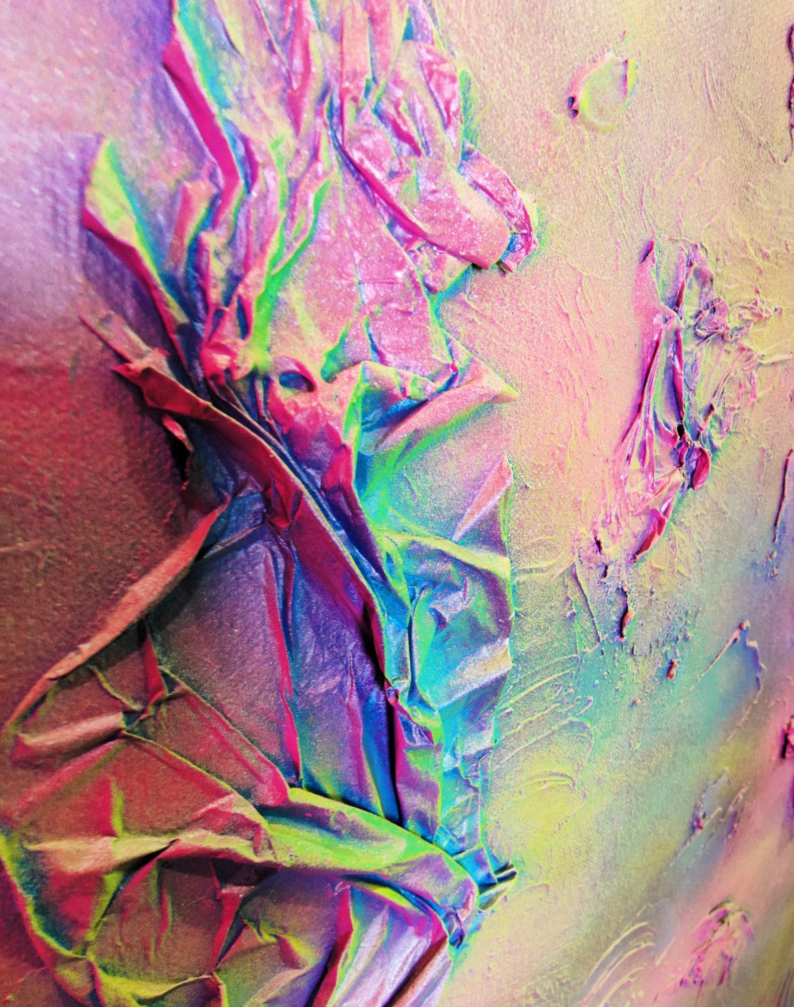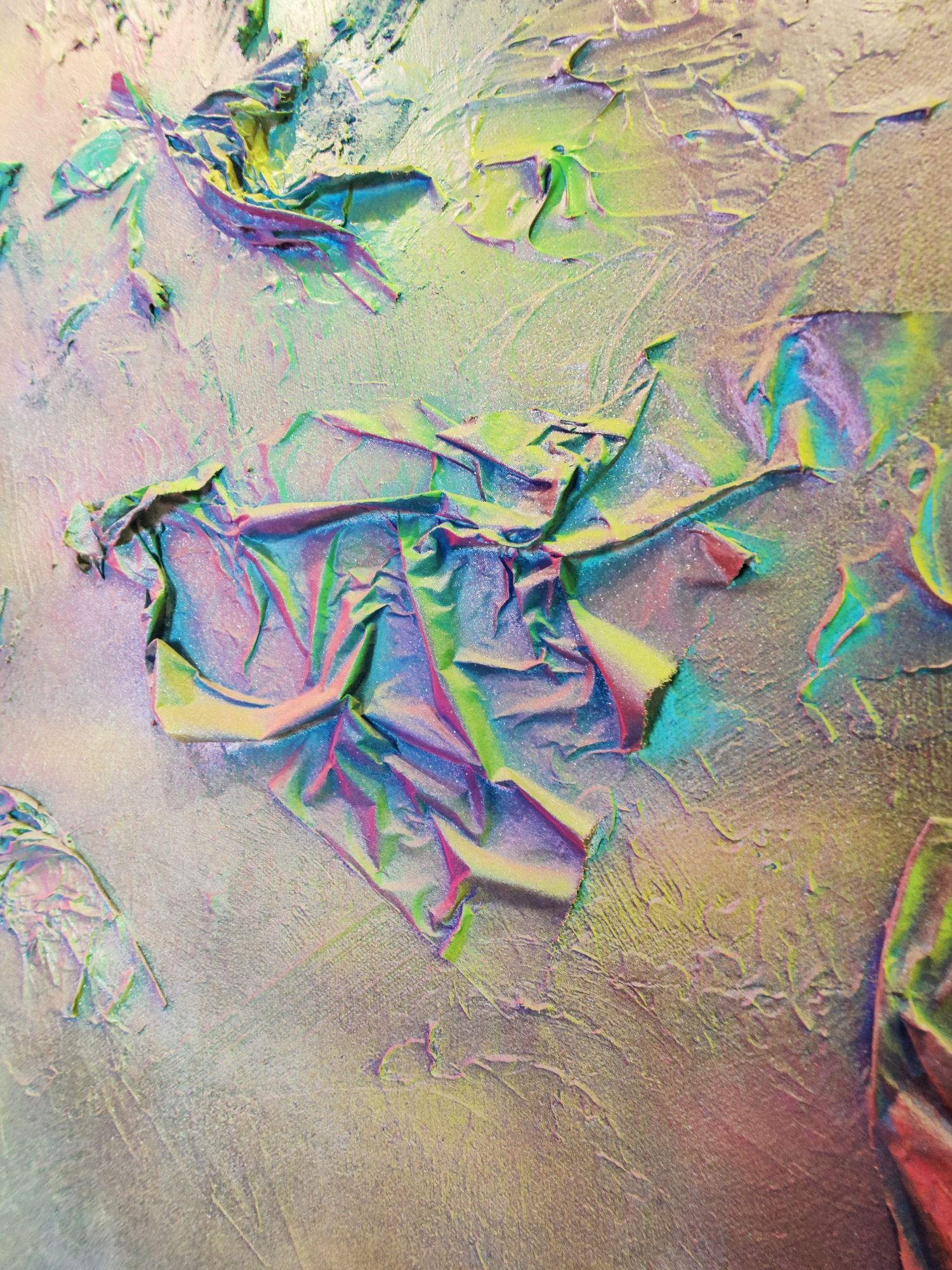 Das Spray legt sich wie ein atmosphärischer Schleier über das Werk. Die Farben – Pink, Gelb, Grün, Türkis, irisierende Übergänge – fließen ineinander, ohne Dominanz. Sie wirken emotional statt narrativ.