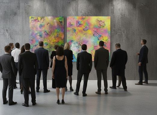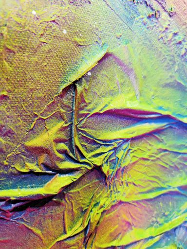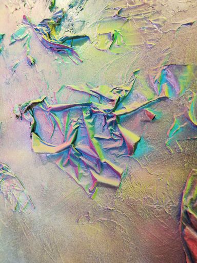 Durch die Spraytechnik entstehen diffuse Farbräume, die sich gegenseitig durchdringen, ähnlich wechselnder innerer Zustände. Nichts ist klar abgegrenzt, alles bleibt in Schwebe. Die irisierenden Effekte verstärken diesen Eindruck von Instabilität und Selbstbeobachtung: Je nach Blickwinkel verändert sich die Wahrnehmung.